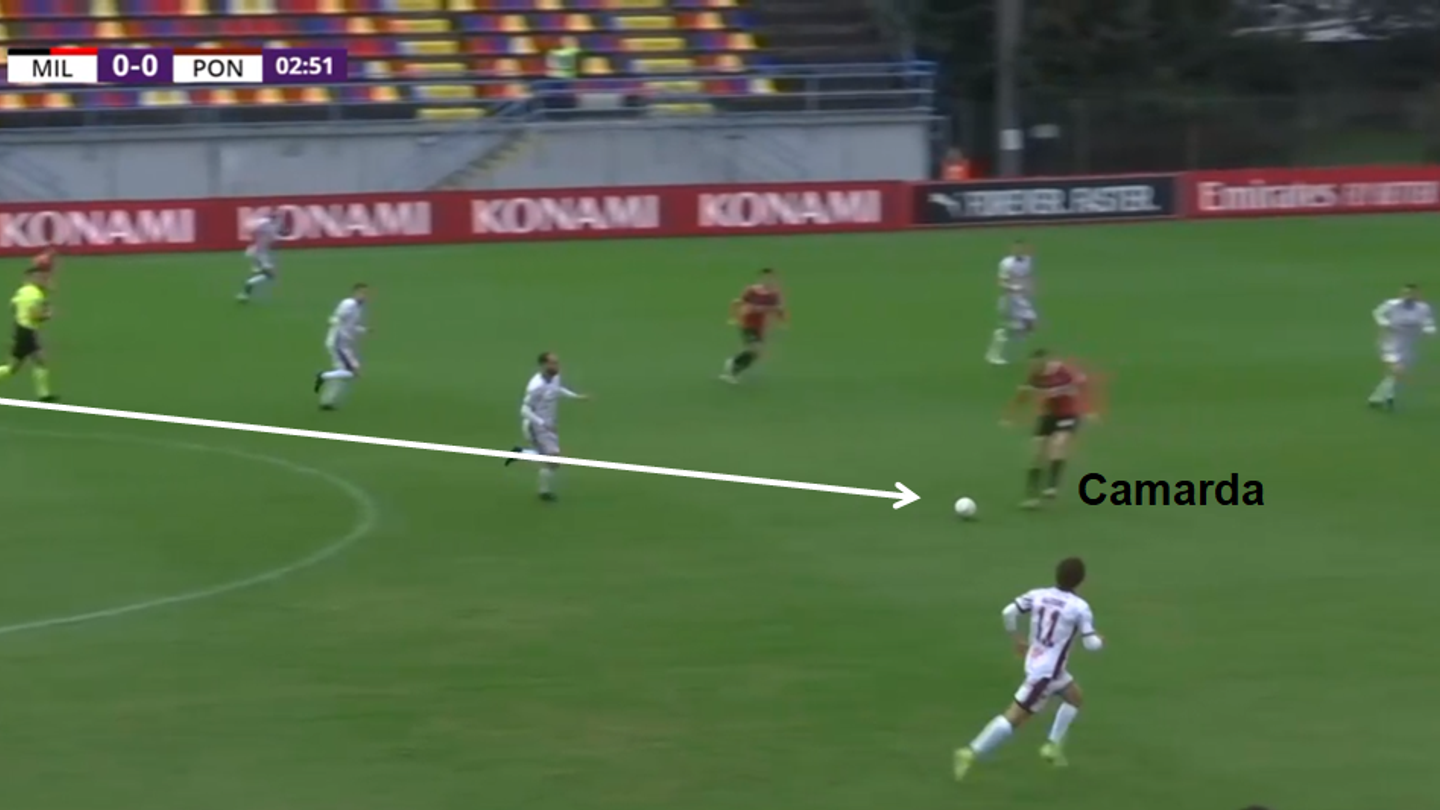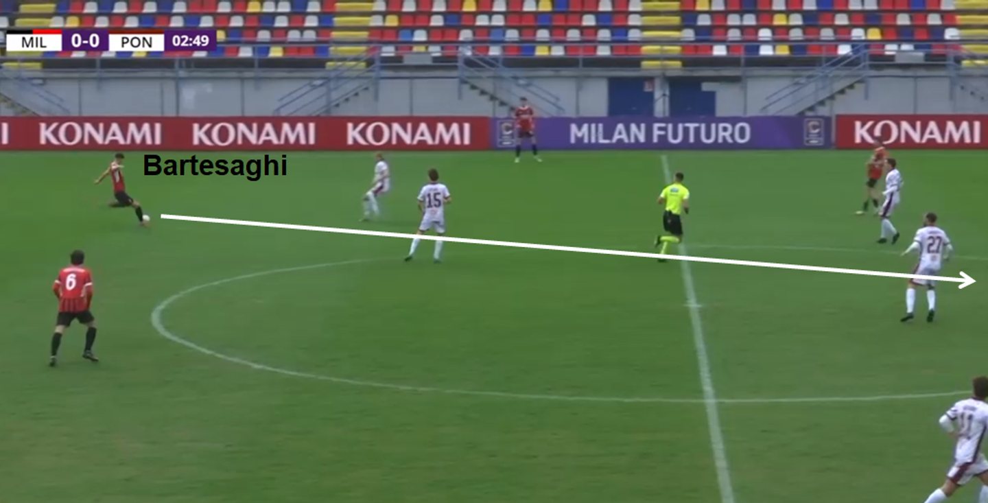 A through ball into the channels is one area where Bartesaghi can improve (he’s yet to complete one in Serie A). It’s a resource he possesses, as these examples from his time with Milan Futuro demonstrate.