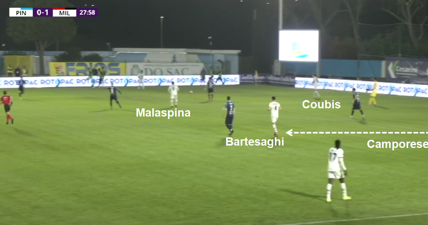 Camporese (the central defender) moves out of frame, with Bartesaghi joining play alongside midfielder Malaspina.