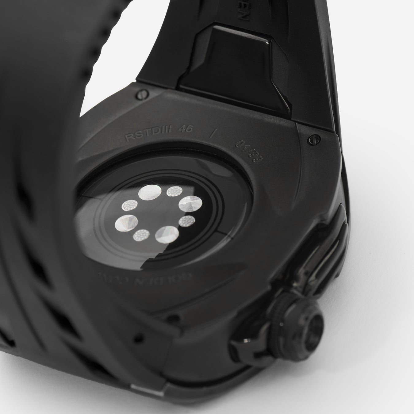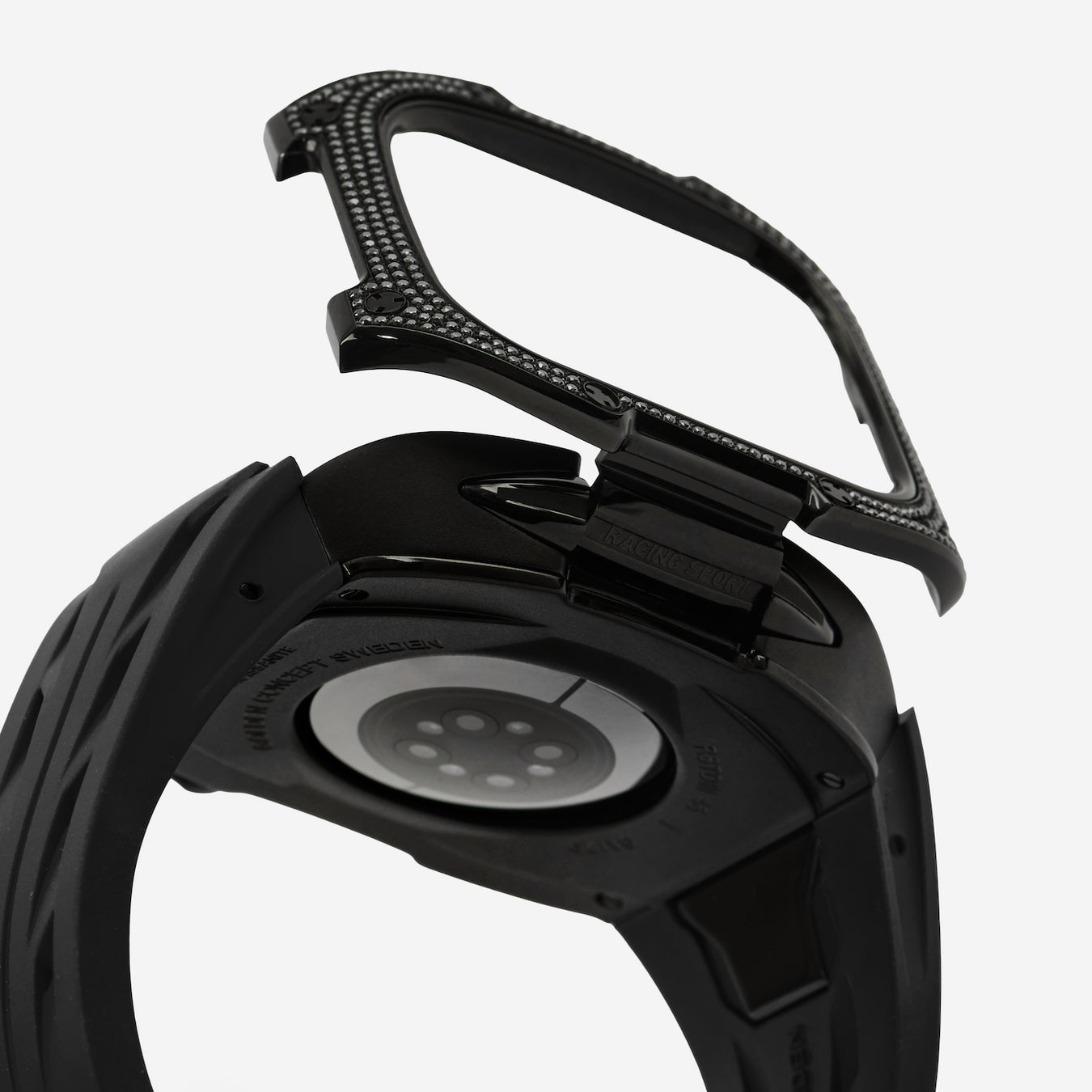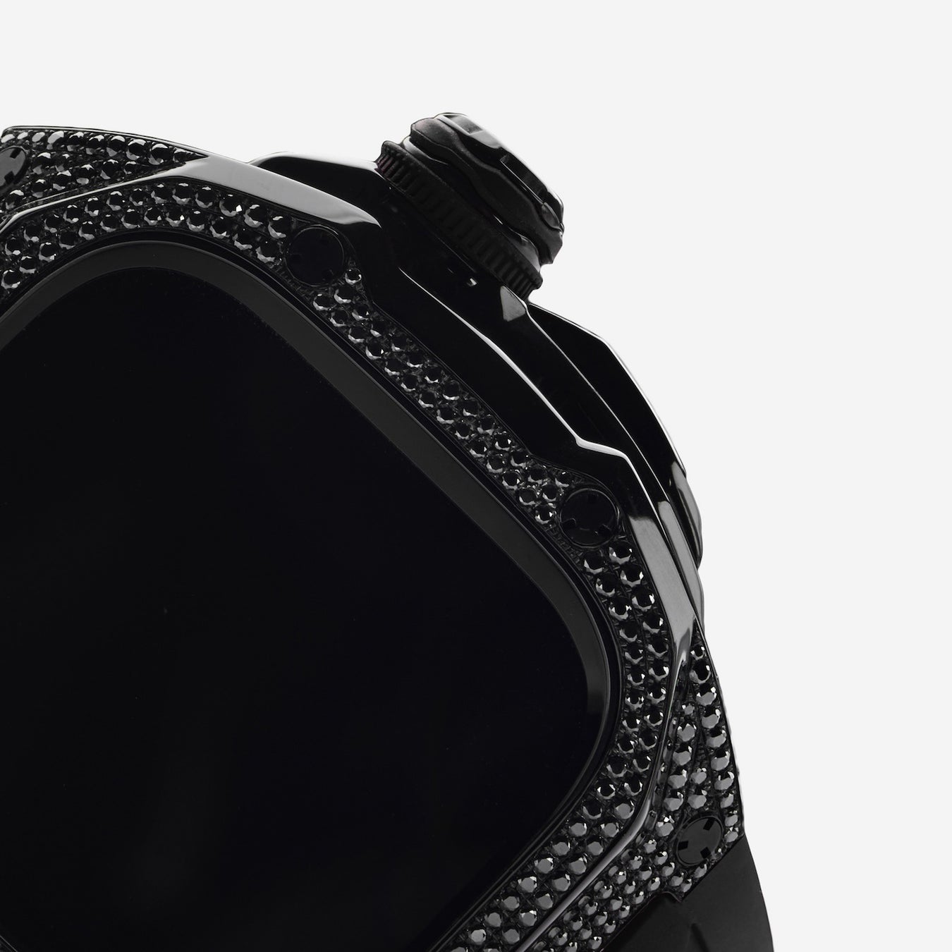 Each case features 410 black moissanite stones (310 in the 46mm model) meticulously hand-set around the bezel. The stones are designed to subtly reflect light, creating depth and texture rather than a flashy appearance. The cases integrate seamlessly with a matching strap featuring a PVD-coated buckle, creating a continuous design.