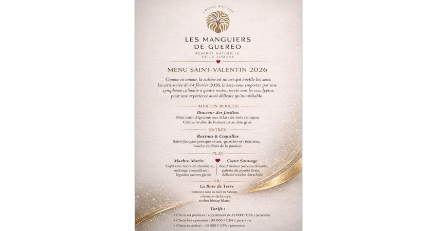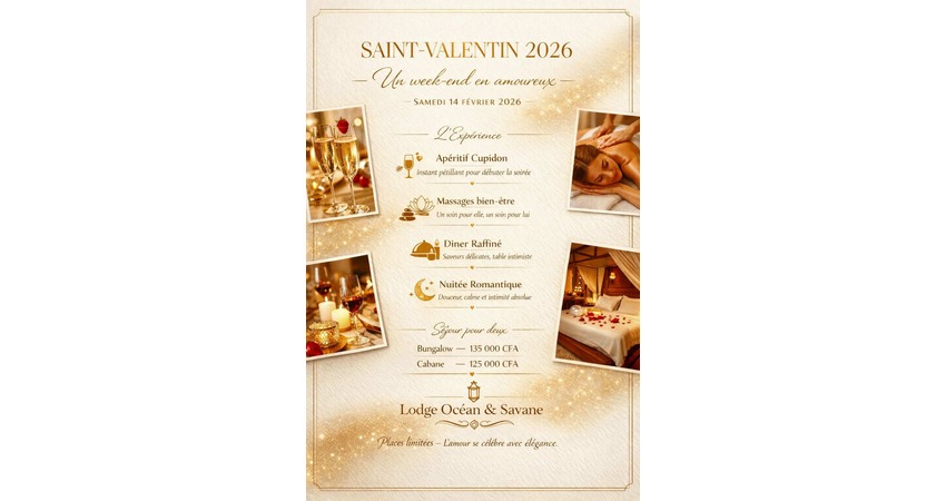 The Lodge Océan & Savane is offering a special Valentine’s Day package designed for relaxation. The experience includes a “Cupid” aperitif, a massage for each person, a refined dinner, and an overnight stay in a peaceful environment between the ocean and nature. The package is intended to provide a restful and intimate escape from everyday life.