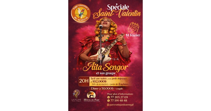 Near Mbour, at Ngeurigne, the Parc Exotique du Sénégal will host a Valentine’s Day evening in a peaceful natural setting. The event will feature a romantic dinner and a live concert by Aïta Senghor, creating an elegant and convivial atmosphere. Guests can extend their experience with an overnight stay to fully enjoy the tranquility of the location.