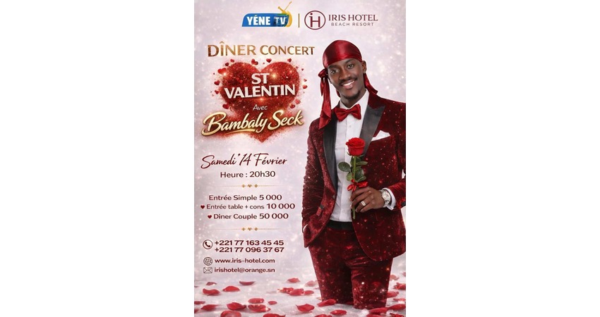 The Iris Hotel Beach Resort is hosting a musical evening with artist Bambaly Seck, combining a festive atmosphere, gastronomy, and romantic décor. The event, designed for both couples and groups of friends, begins at 8:30 p.m. And offers various packages to suit all preferences.